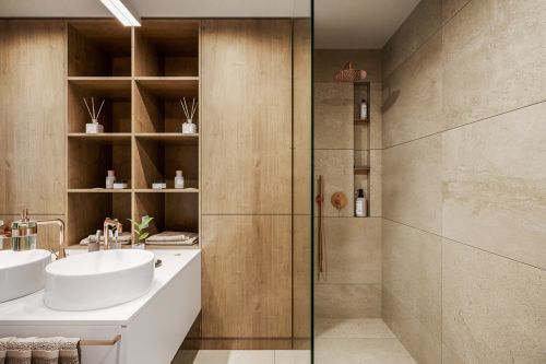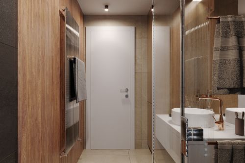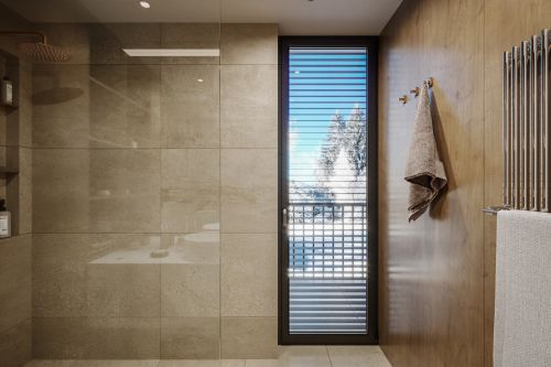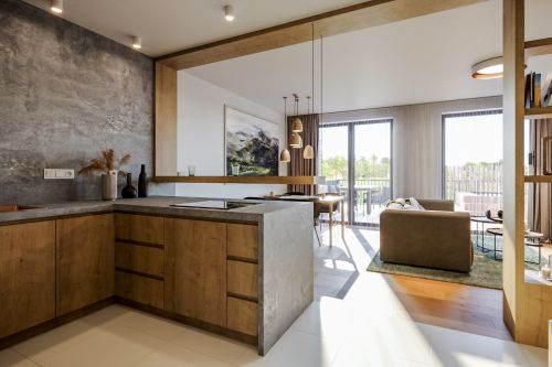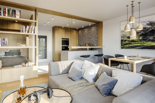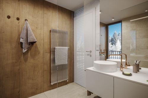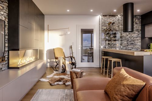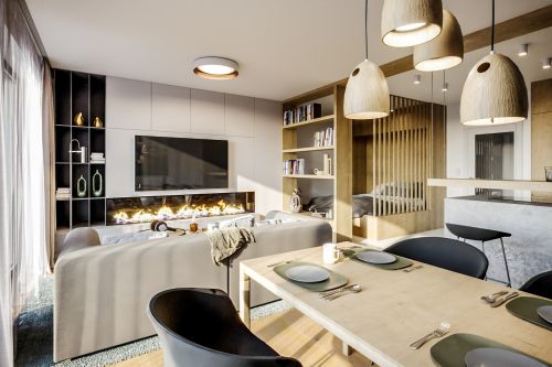 Pro developerský projekt apartmánového domu v Harrachově jsme navrhli možné podoby interiérů. Základem všech interiérů jsou luxusní dřevěné podlahy, bílé jednoduché obložkové dveře a tmavě šedá dřevohliníková okna a doplňky v měděných barvách.
