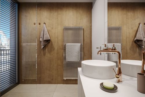 V interiéru je použité zejména dřevo, bílá barva a moderní kámen.